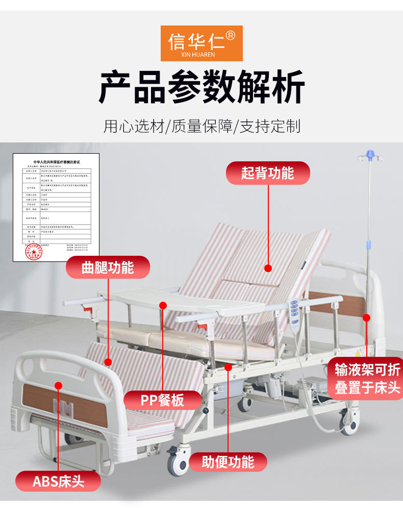標(biāo)準(zhǔn)配置:ABS床頭1副;鋁合金折疊護(hù)欄1副;靜音輪4個(gè)