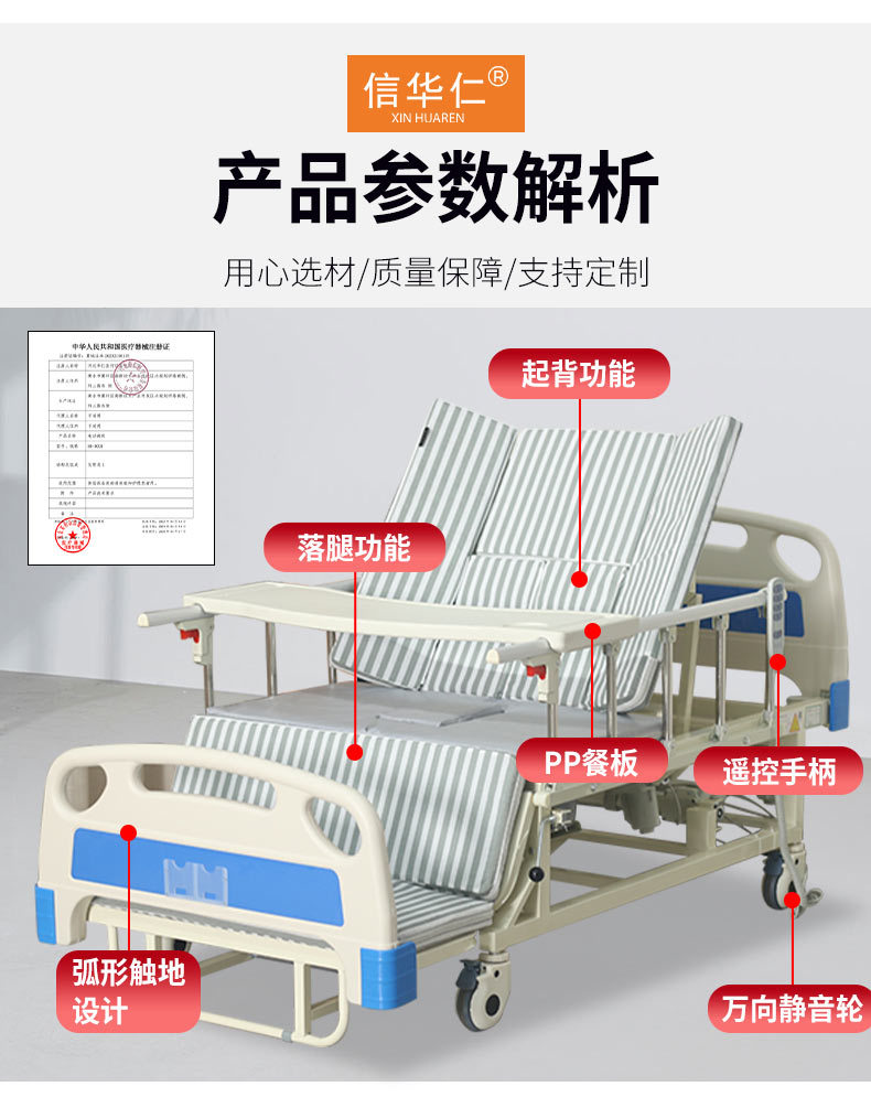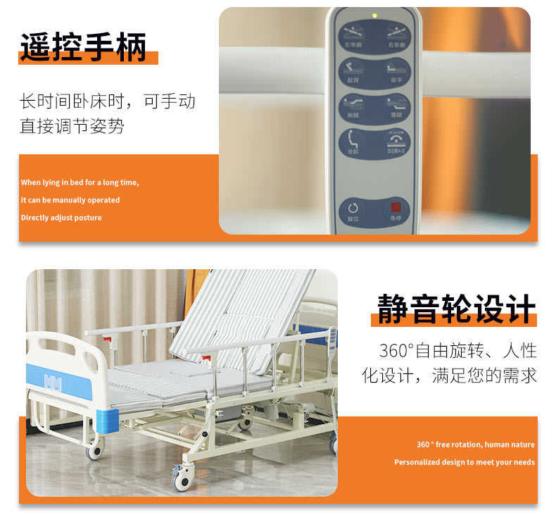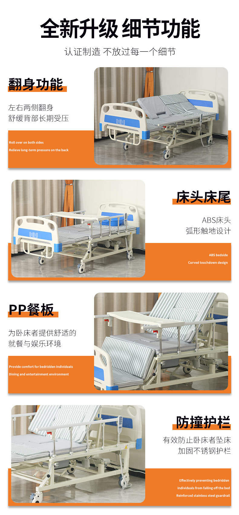 標(biāo)準(zhǔn)配置:ABS床頭1副;鋁合金折疊護(hù)欄1副;靜音輪4個(gè);